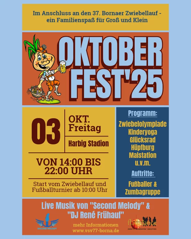 Wir laden ein zum abschwitzen und abfeiern! Am 03. Oktober 2025 um 10:00 Uhr zum 37. Zwiebellauf und im Anschluss ab 14:00 Uhr zum 2. Oktoberfest des VSV'77 Borna im Rudolf-Harbig-Stadion.