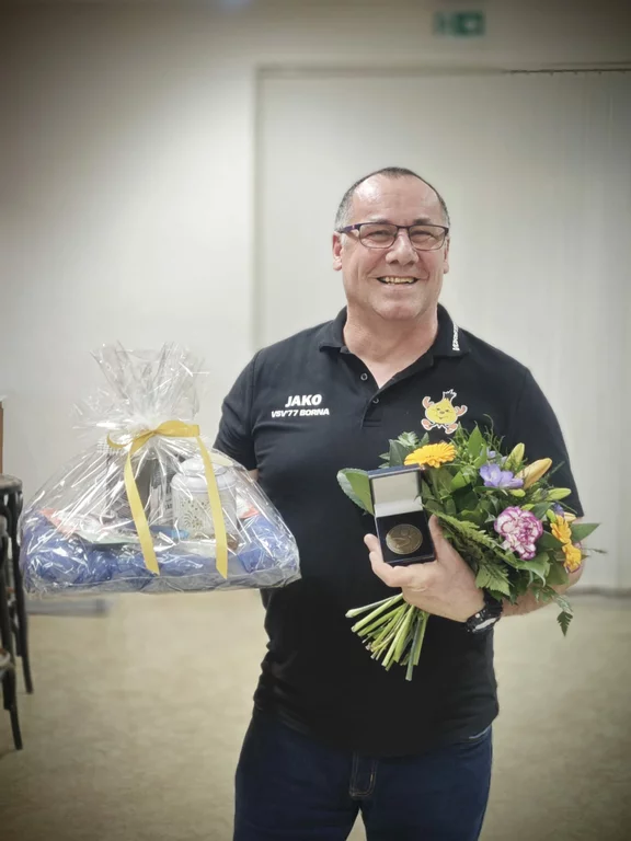Ein ganz besonderer Moment war die Ehrung von Uwe Bergbauer. Seit einem Vierteljahrhundert prägte er den VSV’77 Borna maßgeblich – ob als Vorsitzender (2000–2022) oder als Schatzmeister (2001-2026). Für diesen unglaublichen Einsatz erhielt er im Namen des Kreissportbundes Landkreis Leipzig die Ehrenamtsmedaille für 25 Jahre ehrenamtliche Tätigkeit.